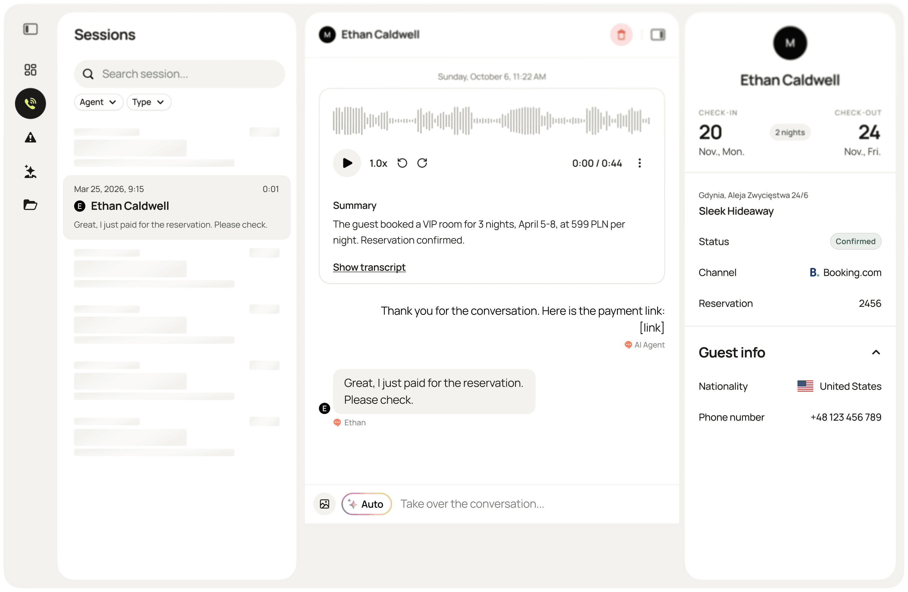 Available 24/7 Agent AI that answers calls from your site, responds to availability inquiries, and helps guests make reservations. Even after the voice call has ended.